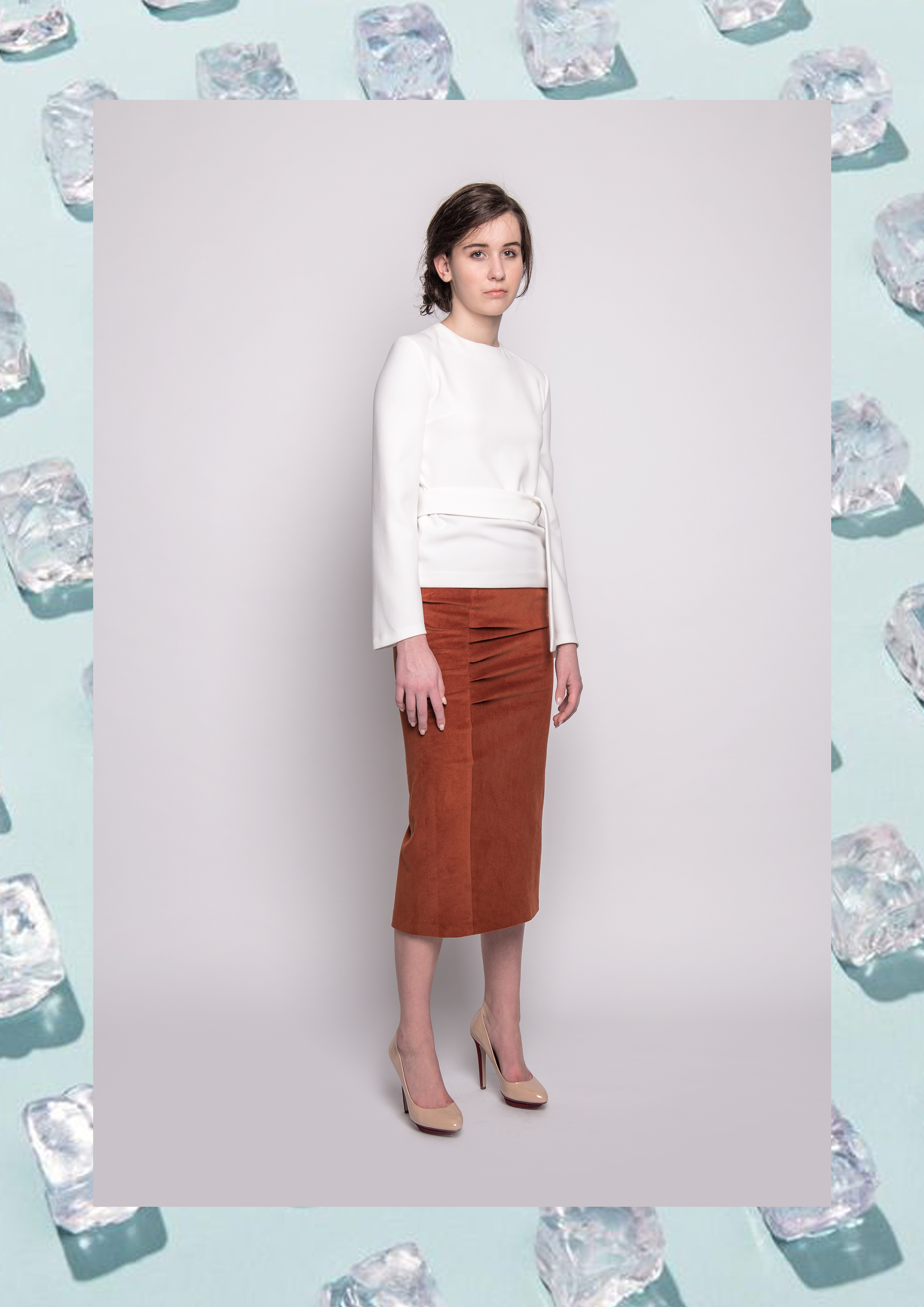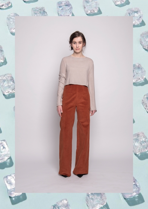 The silouettes of the pieces was designed by the form of the melting ice sheets. According to the autumn-winter season, soft, knitted pieces, buckles and belts play a determinant role in the designes. The greyish white, the pale blue, the powder pink and the rusty-brown pieces remind the arctic region’s and mountain’s atmosphere and colorpalette.